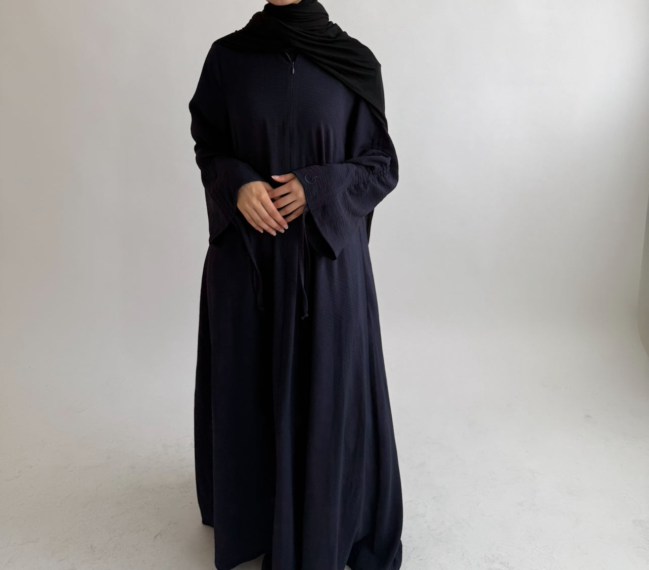 Elegant and functional, this abaya features stylish ruched sleeves and a discreet front zip that’s perfectly matched to the fabric for a seamless look. Made from breathable, flowy fabric with a sleek no-pocket design, it’s perfect for everyday wear or special occasions.